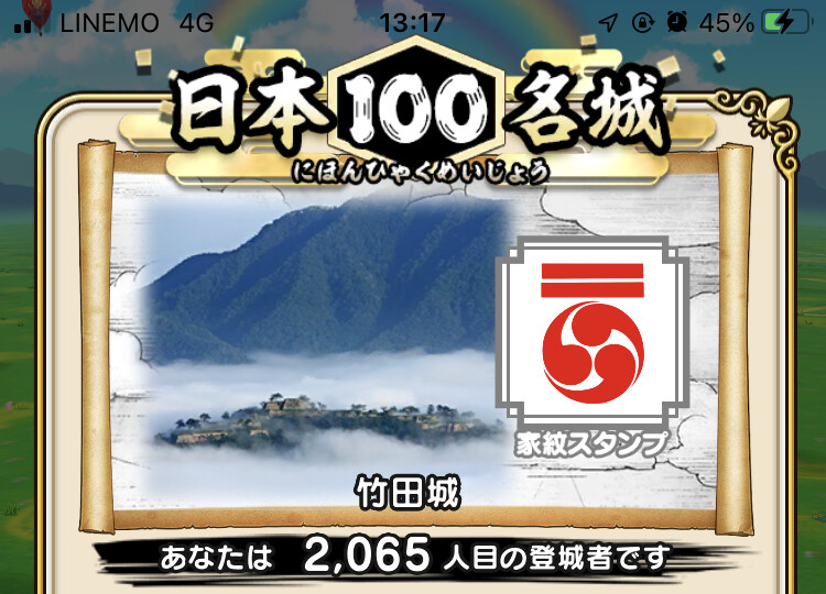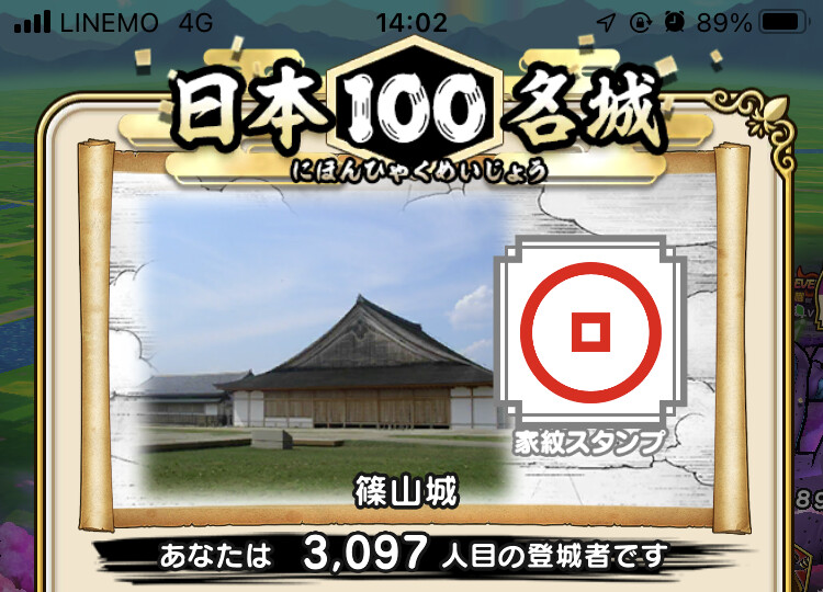 DQウォークでは竹田城跡出口から少し歩いた所にある山城の郷付近に行くと登城扱いになる。